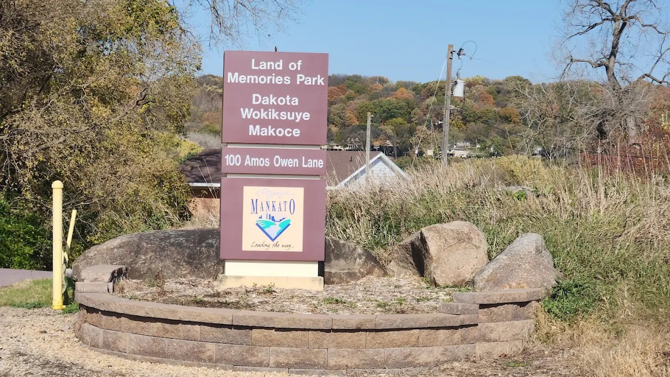 Land of Memories Park is located at 100 Amos Owen Lane in Mankato, Minnesota. Its proximity to major roads and city amenities makes it easy to reach while still offering a natural riverside environment.
